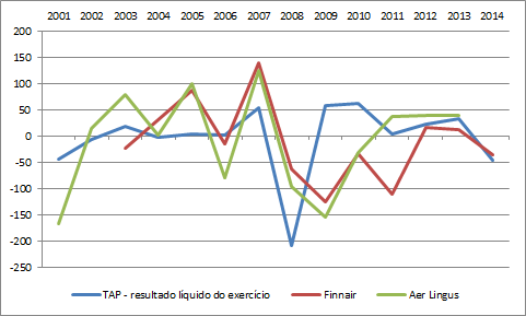 ilustra a evolução do resultado líquido de TAP, Finnair e Aer Lingus. Deste