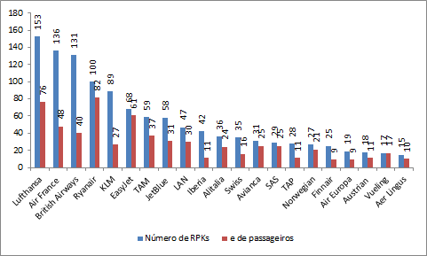 da Aer Lingus com 15 mil milhões de KPU e 10 milhões de passageiros,